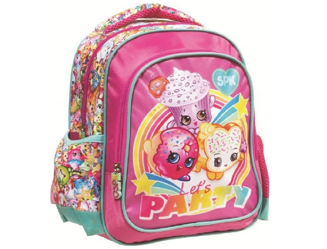 Σακίδιο Shopkins Let’s Party με μια μεγάλη θήκη και μια μικρότερη μπροστά, και δύο πλαϊνές θήκες για την μεταφορά παγουριού.