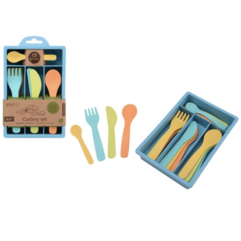 Πλαστικό σετ μαχαιροπήρουνων Jouéco (17 τεμαχίων) από οικολογικό πλαστικό από ίνες σιταριού. 100% ανακυκλώσιμο! Περιεχόμενα: 4 πηρούνια, 4 μαχαίρια, 4 κουτάλια και 4 μικρά κουτάλια. Κατάλληλο από 24 μηνών.