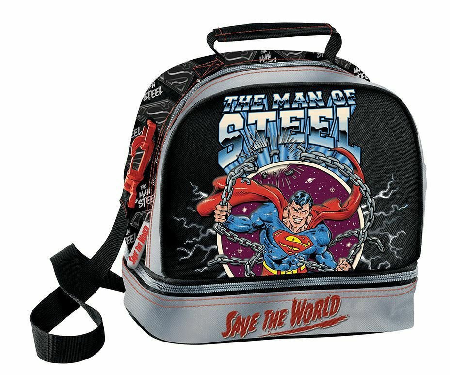 Ένα πρακτικό τσαντάκι φαγητού SUPERMAN! Διαθέτει, μια κύρια θήκη με ισοθερμική επένδυση που κλείνει με φερμουάρ, απαραίτητη για τη σωστή συντήρηση του κολατσιού, και ακόμα μια θήκη στο κάτω μέρος της τσάντας, ιδανική για την τοποθέτηση μαχαιροπίρουνου και πετσέτας, η οποία επίσης κλείνει με φερμουάρ. Επιπλέον, έχει λουράκι ώμου με ρυθμιζόμενο ιμάντα και χειρολαβή.